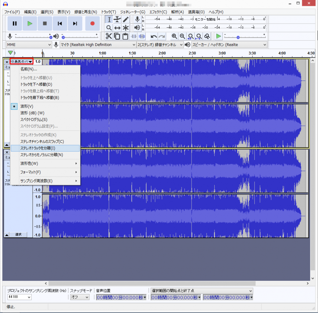 audacityを開いて編集したいファイルをドラッグドロップして、曲名の隣の▼ボタンをクリックして「ステレオトラックを分離」を選択します。(曲名は気にしないでください)