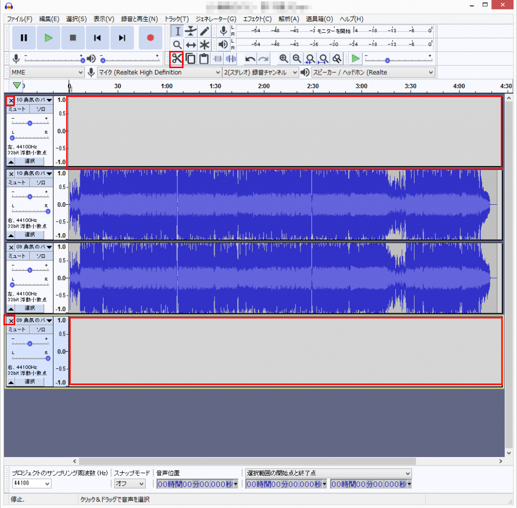 トラックを選択してから切り取り(ハサミマーク)を押すと削除できます。