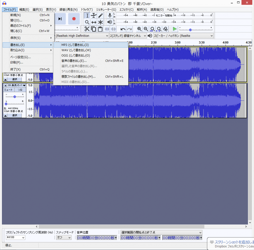 ファイル→書き出し→MP3として書き出しをクリック