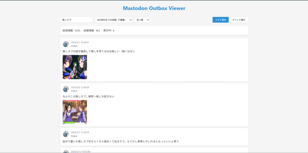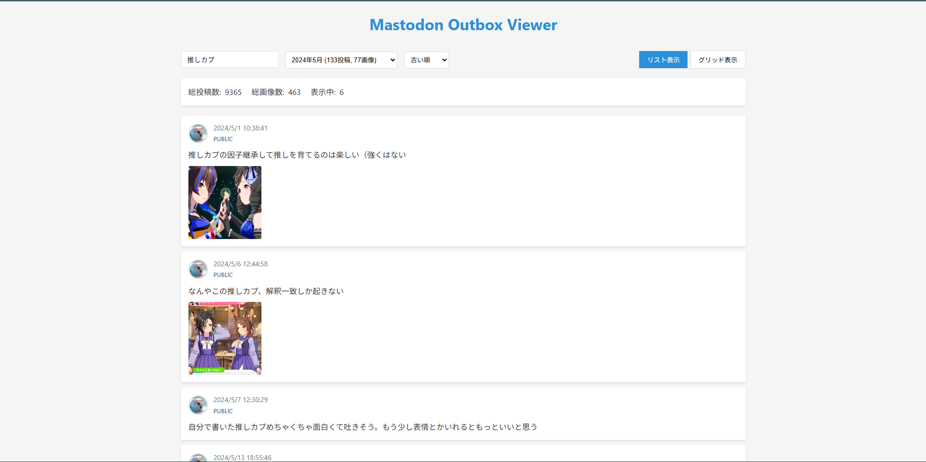 dataフォルダ配下にアーカイブを展開した際のファイルを入れて、トップページのボタンからoutbox.jsonを選択すると投稿内容が見られるhtmlです。 ただのhtmlなのでファイル配置ができればPCでなくとも見られると思います。 202...
