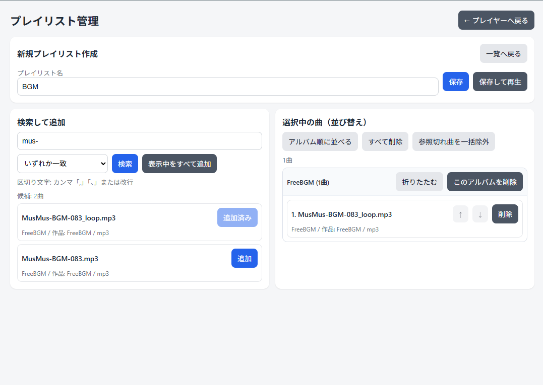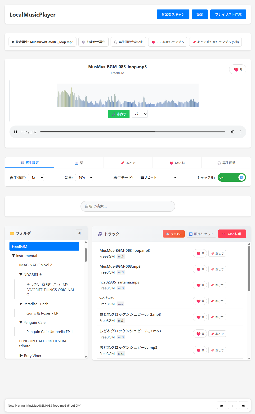LocalMusicPlayerは、musicフォルダ配下の音源をローカルで再生するシンプルな音楽プレイヤーです。